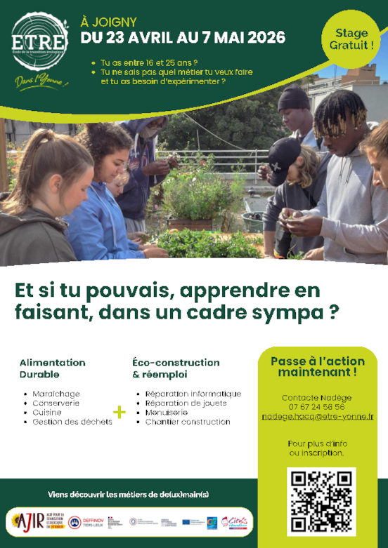 Ce parcours est entièrement gratuit et s’adresse prioritairement à des jeunes de 16 à 25 ans, de Joigny et alentours, éloignés de l’école, de la formation ou de l’emploi, pour leur permettre de découvrir de façon pratique et concrète des métiers manuels liés à la transition écologique (éco-construction, alimentation durable, artisanat valoriste, réparation…).