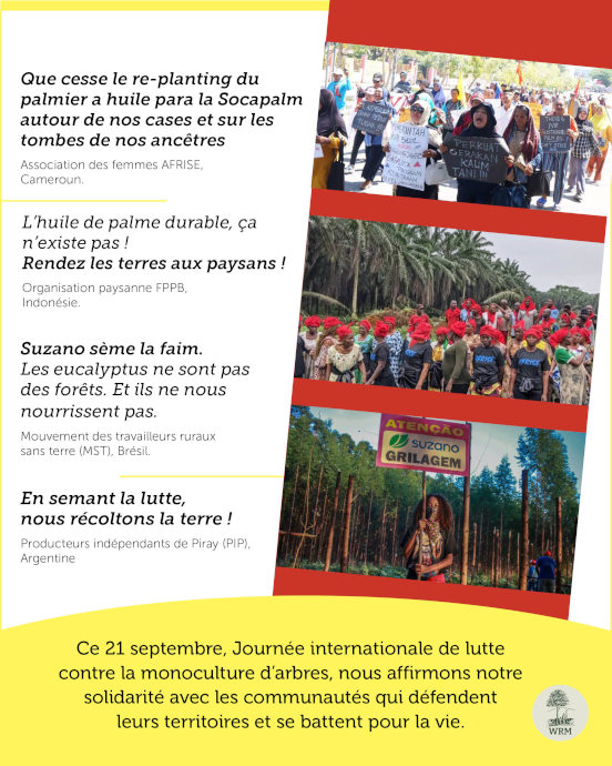 Le 21 septembre est la Journée internationale de lutte contre la monoculture d’arbres. Organisations, réseaux et mouvements célèbrent la résistance etfont entendreleurs voix afin d’exiger que soit arrêtéel’expansion des plantations industrielles d’arbres.